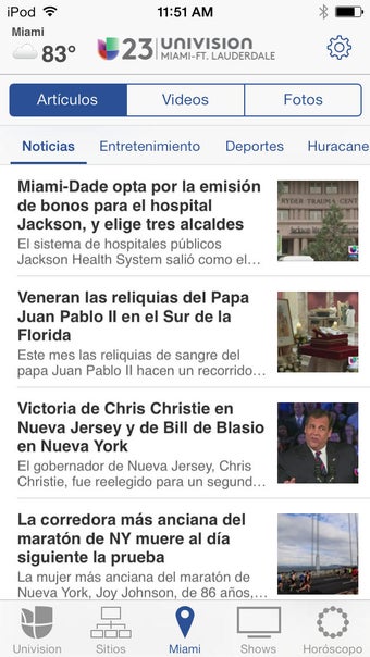 Univision es la aplicación oficial para ver las noticias y programas de la cadena de televisión Univision. En español, podrás informarte de la actualidad, leer sobre entretenimiento y deportes o consultar tu horóscopo o el tiempo.